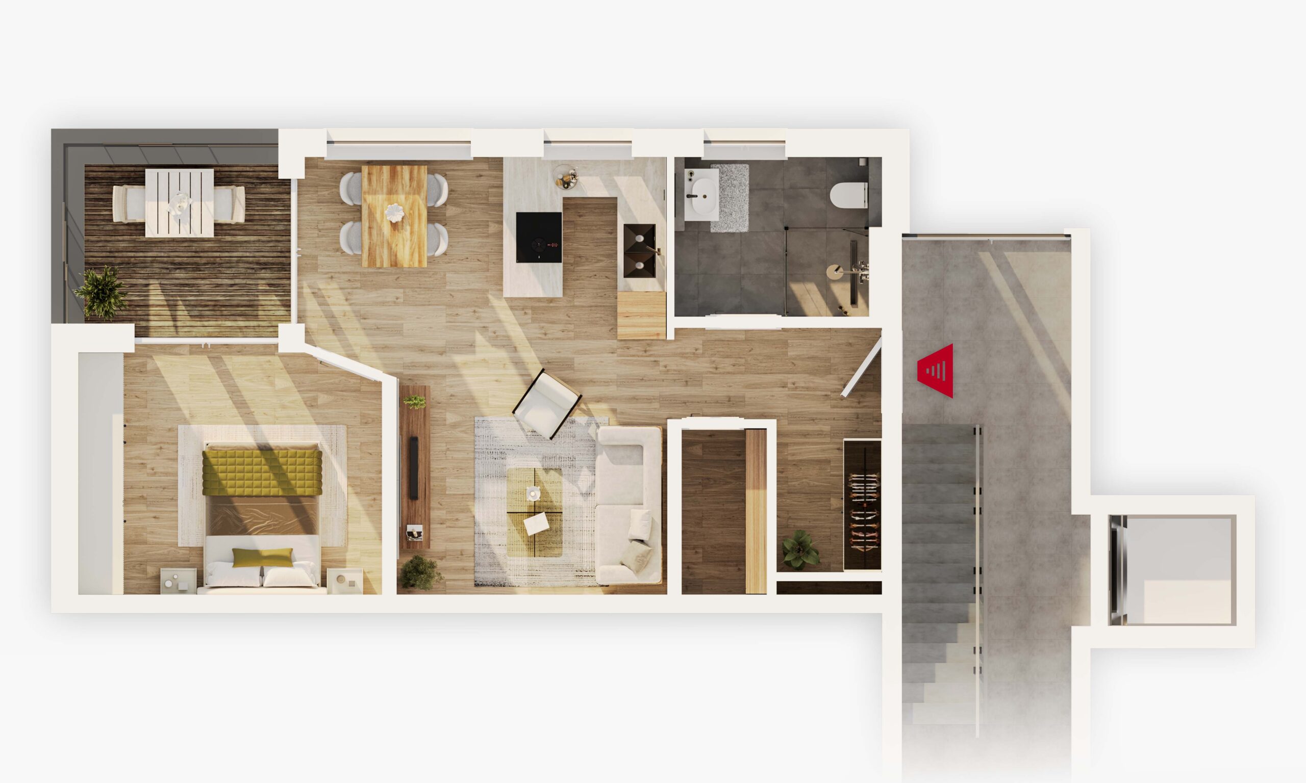 Alle gezeigten Grundrisse sind nicht maßstabsgetreu. Flächenangaben verstehen sich als ungefähre Werte. In Visualisierungen enthaltene Einrichtungsgegenstände (z. B. Möbel, Pflanzen, Küchen oder Geräte) dienen nur der Illustration und sind nicht Bestandteil des Angebots. Architektur-Visualisierungen sollen ein besseres Verständnis für das Gebäude ermöglichen, erheben aber keinen Anspruch auf vollständige oder verbindliche Darstellung in Farbe, Umfang oder Ausstattung. Maßgeblich sind ausschließlich der notariell beurkundete Kaufvertrag sowie die zugehörigen Pläne und die Baubeschreibung.